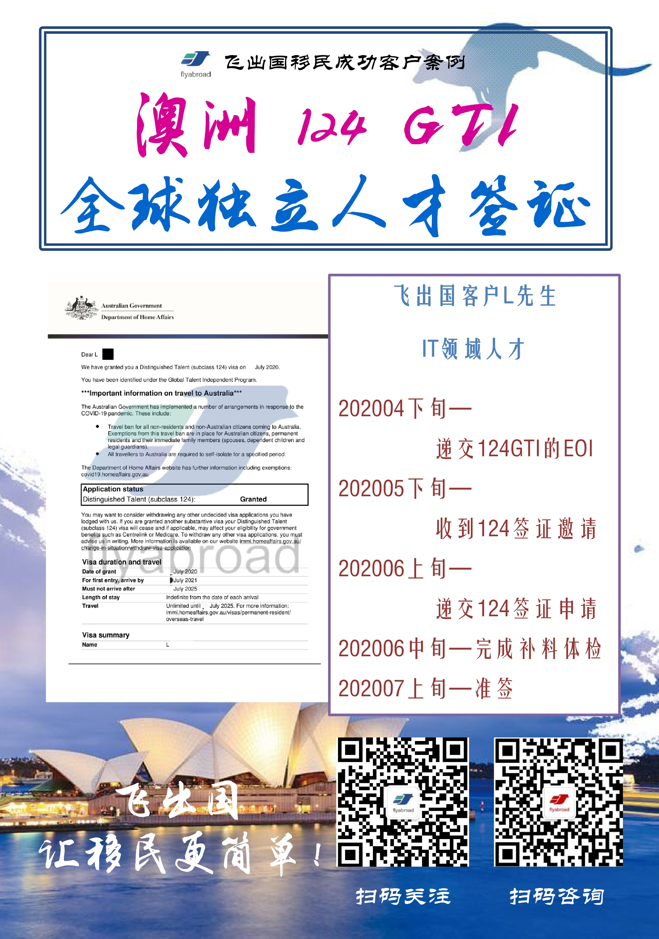 【澳洲124GTI全球独立人才签证成功案例】飞出国客户L先生,IT领域人才,硕士学历,发表文章虽然不多但是技术突出,疫情期间offshore依然快速下签,整体不到3个月!这个无年龄限制、无需雅思、无需职业评估的澳洲移民快速通道果然名不虚传,GTI全球独立人才计划是澳洲移民局优先审理项目,如果您的职业在七大特殊领域内,请尽快联系飞出国,飞出国将助您快速移民澳洲。