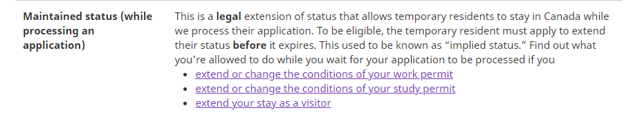 Maintained status是身份的 合法 延期,允许临时居民在我们处理他们的申请时留在加拿大。要符合资格,临时居民必须在其身份到期 之前 申请延长其身份。这种状态曾经被称为“隐含状态”。一般发生在以下情况