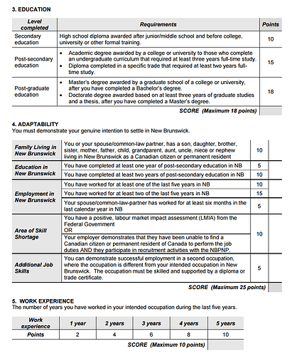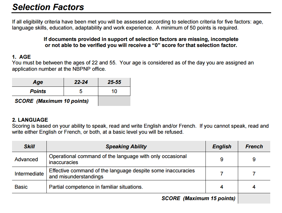NBPNP Skilled Worker Applicants With Employer Support 类别评分标准的5大核心因素是:年龄,语言,教育,适应能力和相关职业的工作经验。