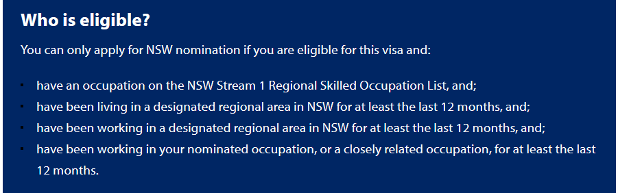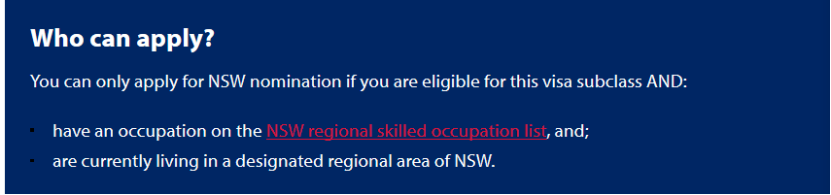 - 提名职业在NSW Stream 1 Regional Skilled Occupation List列表上;