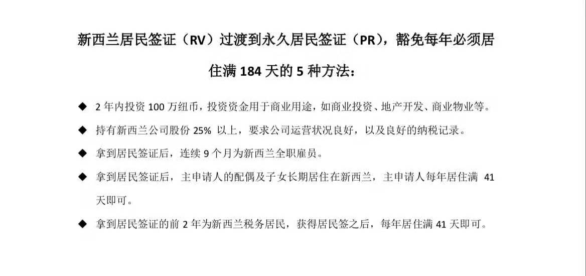 在申请PRV(permanent residence)的前两年内,以居民RV(resident)的身份在新西兰每年住满184天