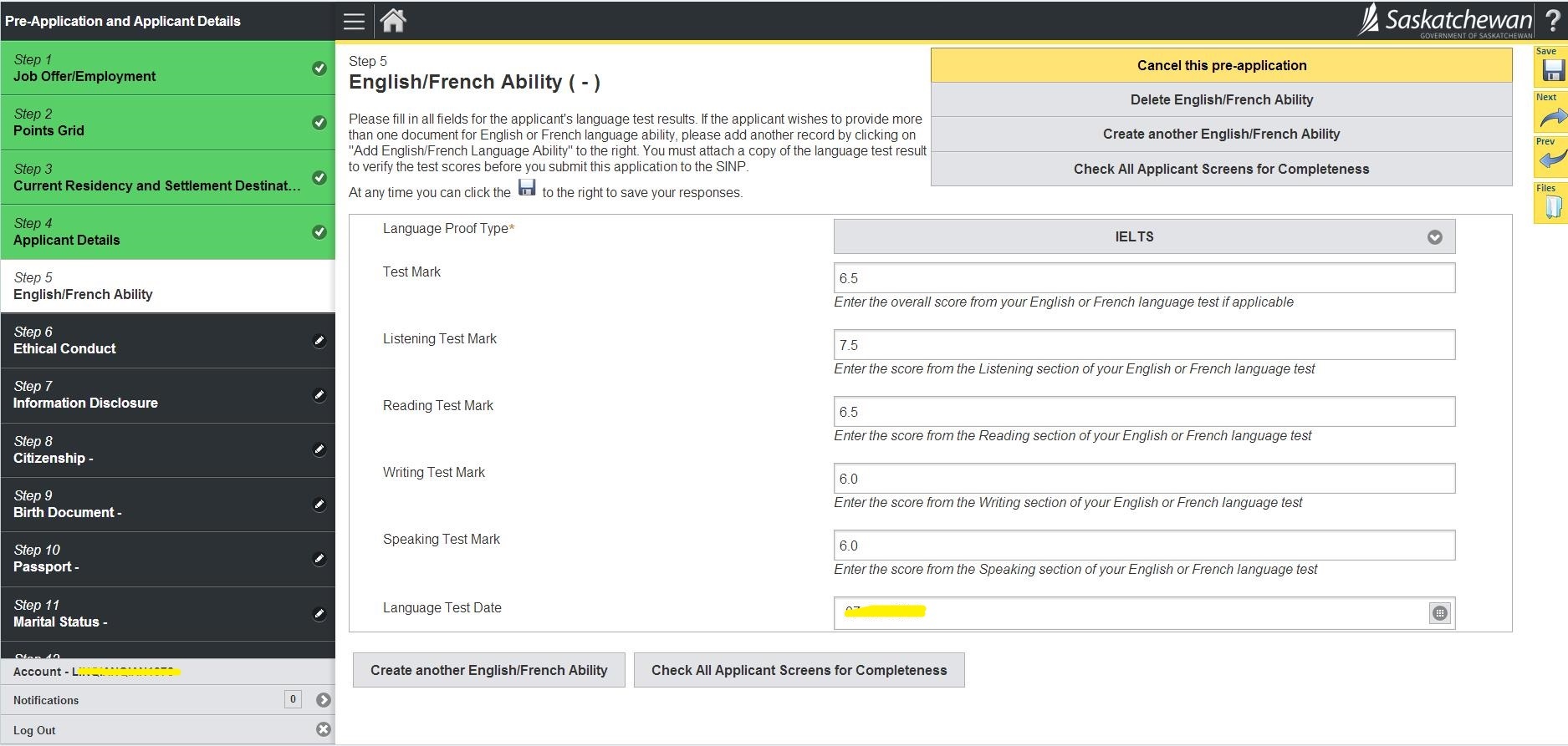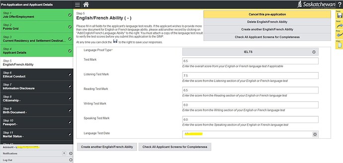 12.注意有无填写雅思的界面,没有的话自己点右上方的Create an English/French Ability创建