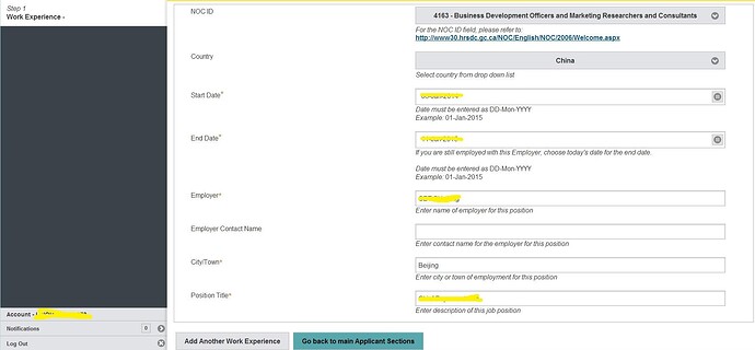 21.回答完第一个问题,然后点右上方的Enter/ChangeWork Experience 创建工作信息填写界面;注意填完信息后该页第二个问题要选Yes