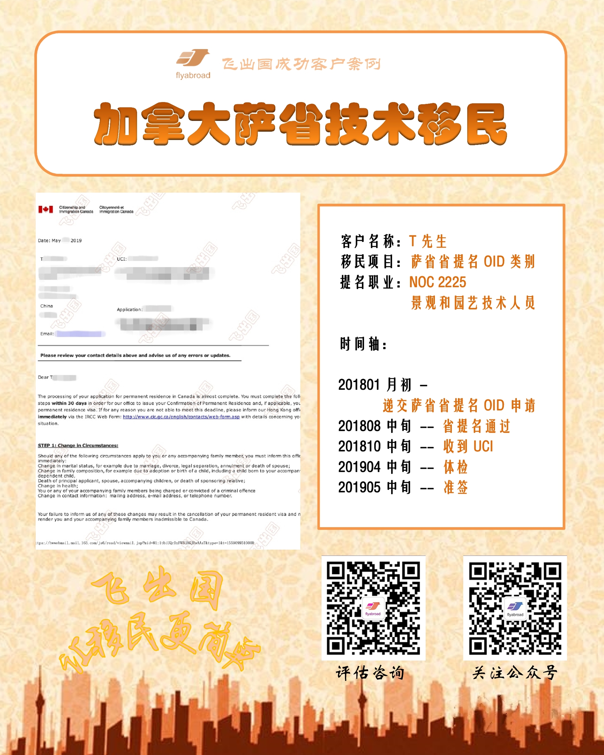 【加拿大萨省技术移民案例】飞出国客户T先生,职业2225景观和园艺技术人员,201801月初,递交萨省省提名OID类别申请;201808中旬,省提名通过;201810中旬,收到UCI;201904中旬,体检;201905中旬,准签!