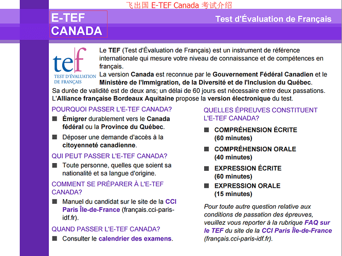下面是加拿大法语联盟(alliance-francaise)对 TEF-CANADA 的介绍: