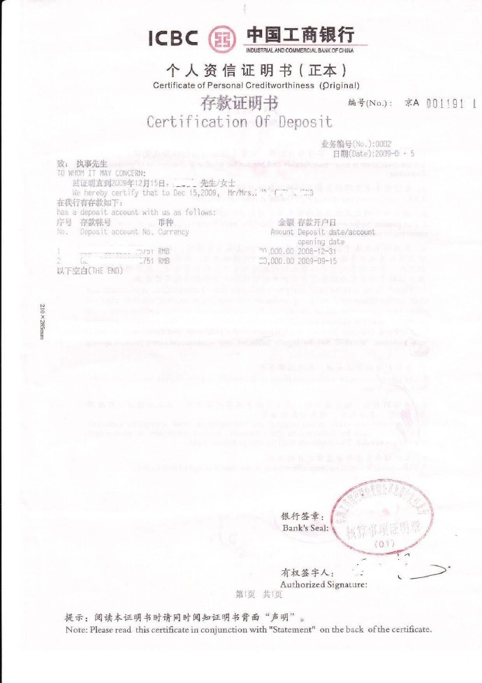 银行存款证明是由银行出具的证明您的银行账户里有指定数目的存款的证明文件,都是中英文的。存款证明的办理很简单,拿着身份证和活期/定期存折(存单或银行卡也可以)到银行柜台办理就可以,各大国有银行及商业银行的存款证明都可以,外国银行也可以,注意不要在邮政储蓄,农村信用社和城市商业银行。很多银行开存款证明需要有定期账户,办理之前先跟银行大堂人员咨询一下,因为可能需要填单子,并且拿的号也可能不是普通的个人人民币业务(例如可能是理财金号),一问便知。开具存款证明一般需要一定数目的手续费。