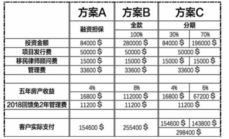 - C 方案是获批身份前支付280000美金30%的款项,也就是84000美元,房产建成后支付70%款项,也就是196000美元,加上其他费用及返还,实际总花费是 298400 美元,这种方案适合感觉房产建成后再付款更稳妥的申请人。