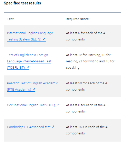 - 申请人(或者加分配偶)提供近三年内考出的四项为6的雅思成绩(或者听12读13写21说18的托福成绩,四项为50的PTE成绩,四项为B的OET成绩,总分169的CAE成绩)