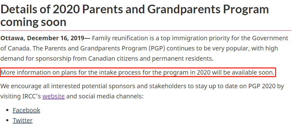 飞出国:2019.12.16加拿大移民局通知2020年父母&祖父母团聚移民即将开放的消息,具体细节暂未公布,可以关注下官网消息。一旦公布细节,飞出国将会第一时间为大家解读。虽然官方没有说今年的申请形式,不过看情况不出意外的话应该还会是先到先得在线抢的形式。