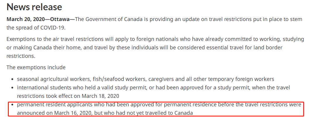 - 在2020年3月16日加拿大宣布旅行禁令之前已经准签的移民申请人