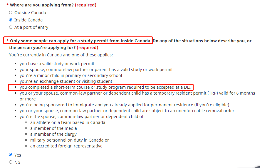 这里我们重点看下第五点( you completed a short-term course or study program required to be accepted at a DLI),即已经完成了一个短期课程(在这个短期课程中所获得的成绩符合了专业课录取的要求),并收到了DLI院校所发出的录取通知书的申请人。 所以,大家常说的旅转学也就是这种情况,这也是为什么即使是语言成绩比较好的申请人通常也要在加拿大境内读少于6个月的语言课程的原因,否则无法在加拿大境内递交学签。当然,有些申请人的语言达不到专业课录取要求也不得不学习一段时间语言课!