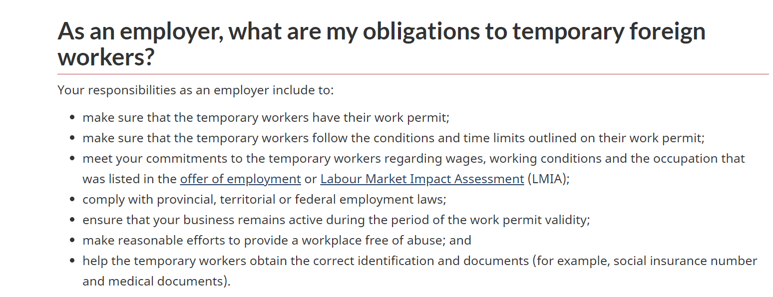 履行您对临时工的有关工资、工作条件和就业机会(LMIA) 中列出的职业的承诺;