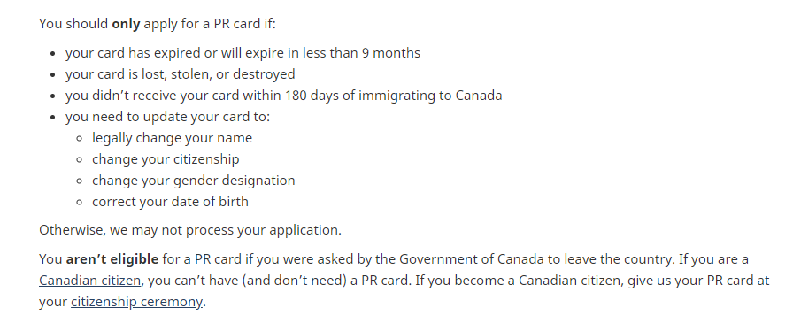 您需要有效的永久居民 (PR) 卡才能乘飞机、火车、巴士或船返回加拿大。如果您知道您的卡会在您旅行时过期,请在离开前更新。您只能在加拿大更新您的卡。我们不会将永久居民卡发送到非加拿大地址,也不允许第三方为您获取。