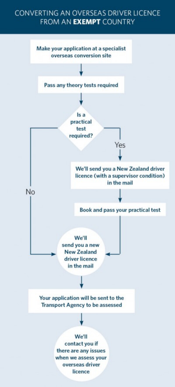 如果您要从豁免国家转换汽车或摩托车驾照(新西兰 class 1 or 6),则无需参加任何理论考试。如果您持有驾照超过两年,则无需参加任何实际驾驶考试,只要您的驾照清楚地显示签发日期是两年多前。如果没有,您需要从所持驾照的许可机构获得文件以确认您持有它超过两年,或者您可以选择参加实际驾驶测试。