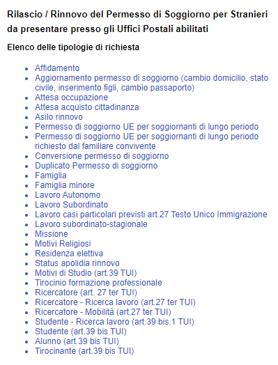 商务事务(Affari)、医疗治疗(Cure Mediche)、体育赛事(Gara sportiva)、人道主义原因(Motivi Umanitari)、政治庇护(Asilo politico,申请或签发)、未成年人身份(Minore età)、司法事务(Giustizia)、无国籍身份(Status apolide,签发)、未成年人融入(Integrazione minore)、邀请(Invito)