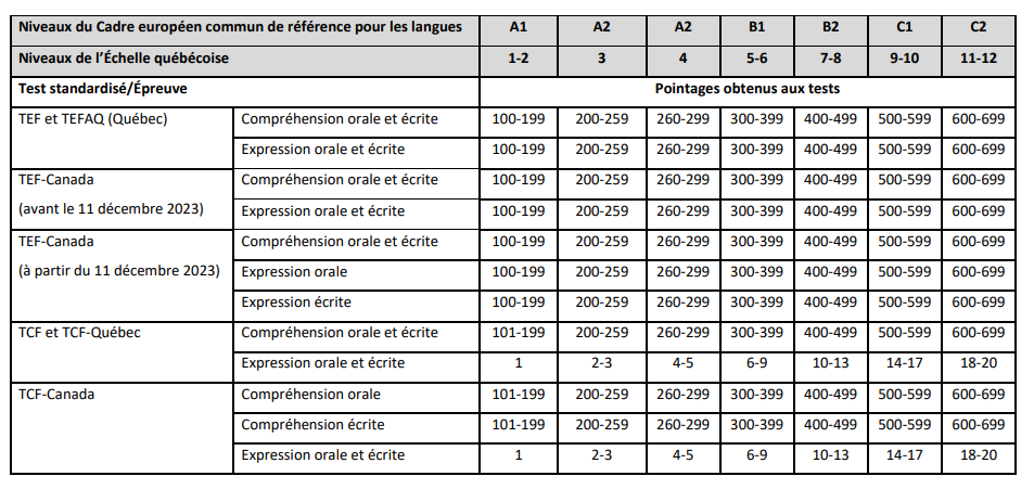 测试结果需在永久甄选申请日前2年内获得。DELF/DALF需提供完整数字化文凭。仅接受官方授权考试中心出具的成绩。各法语考试类型对应的魁北克法语等级标准