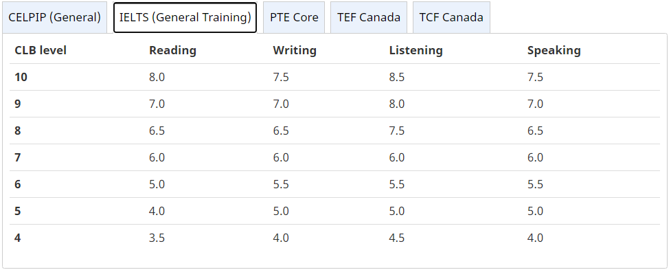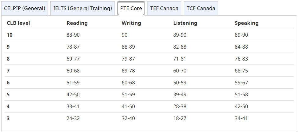 英语认可的是IELTS General Training test, CELPIP General test, PTE Core test;