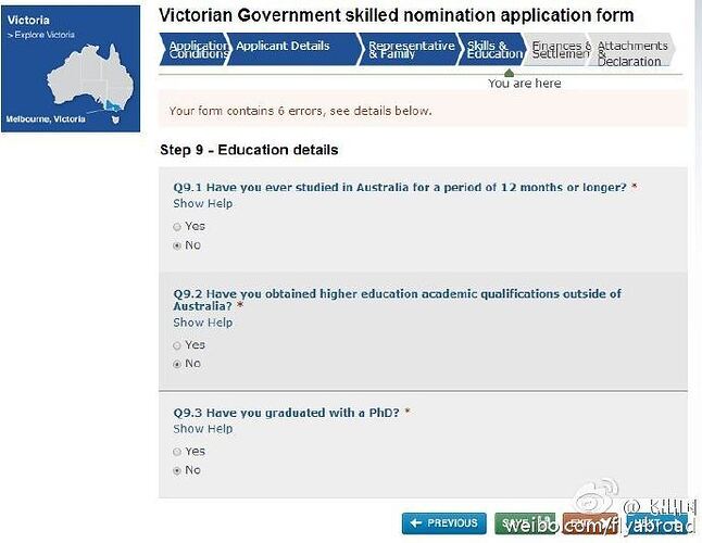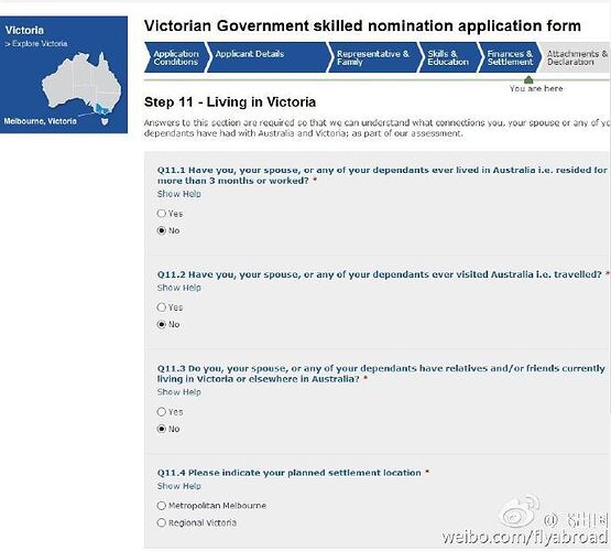 19.是否在维州定居过,如实填写,完成后点击NEXT继续(飞出国):