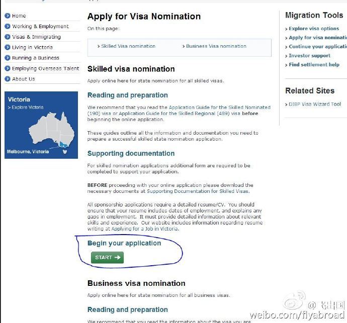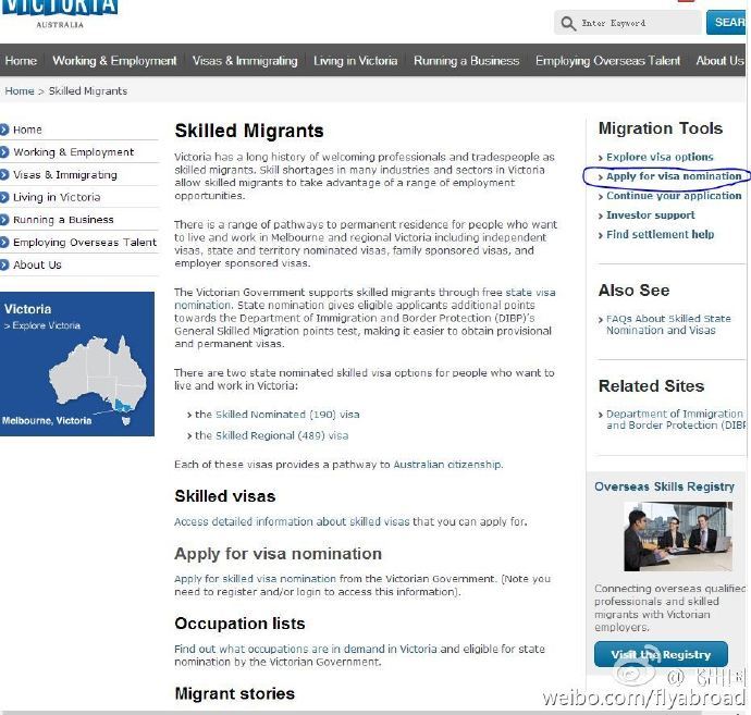 1.登陆维州官网:http://www.liveinvictoria.vic.gov.au/information/skilled-migrants,点击右侧的 Apply for visa nomination(飞出国):