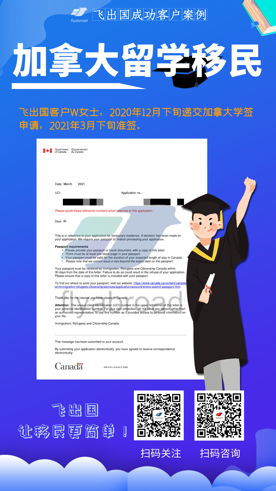【加拿大留学移民成功案例】飞出国客户W女士加拿大学签获批